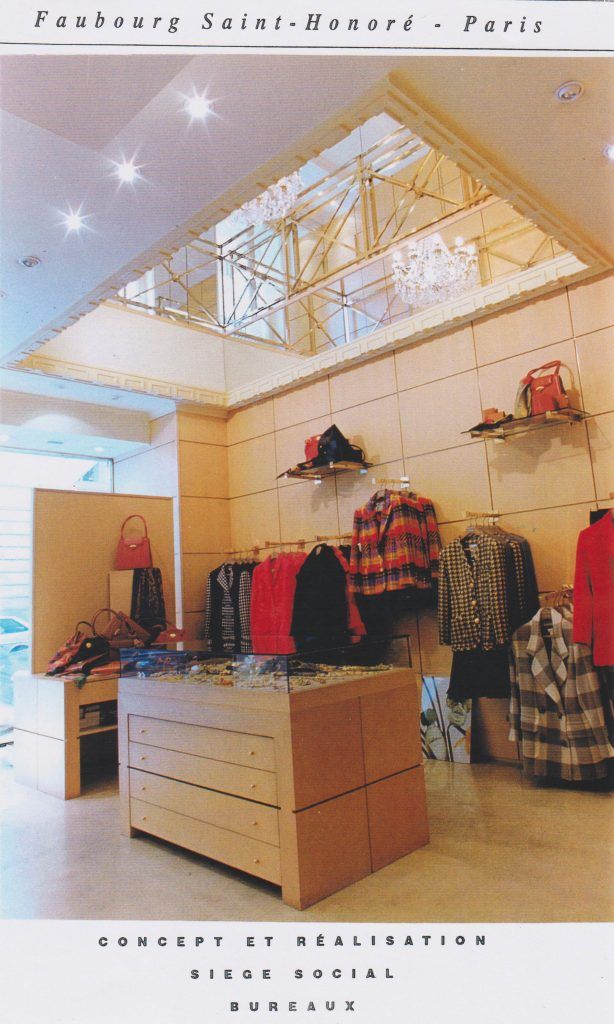 Conception et réalisation de l’ensemble des boutiques, salon, chaise, miroir, applique, table demi-lune, escalier reflets l’image de l'enseigne.
